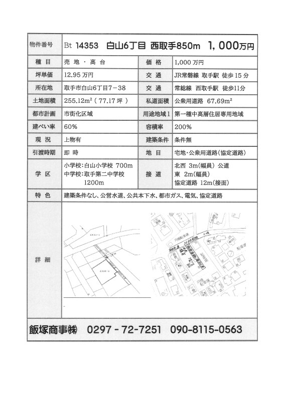 | 特色 | 建築条件なし、公営水道、公共本下水、都市ガス、電気、協定道路(持分3分の1)、 |